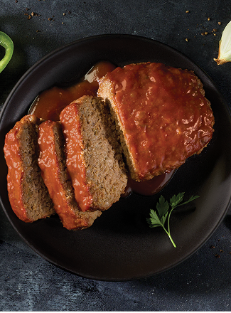 Beef Meatloaf topped with zesty tomato sauce and sweetened with brown sugar.